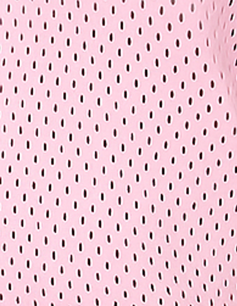 A light pink short-sleeve knit top with an openwork pattern and a soft collar.