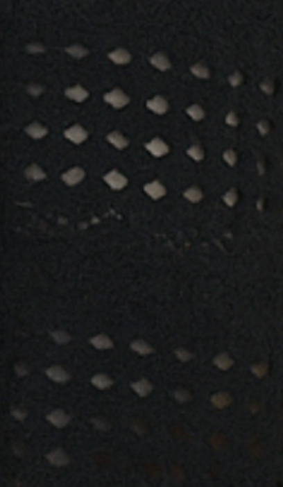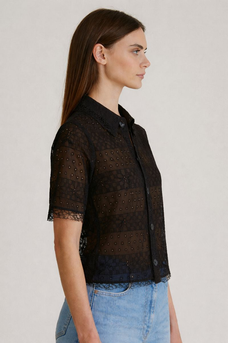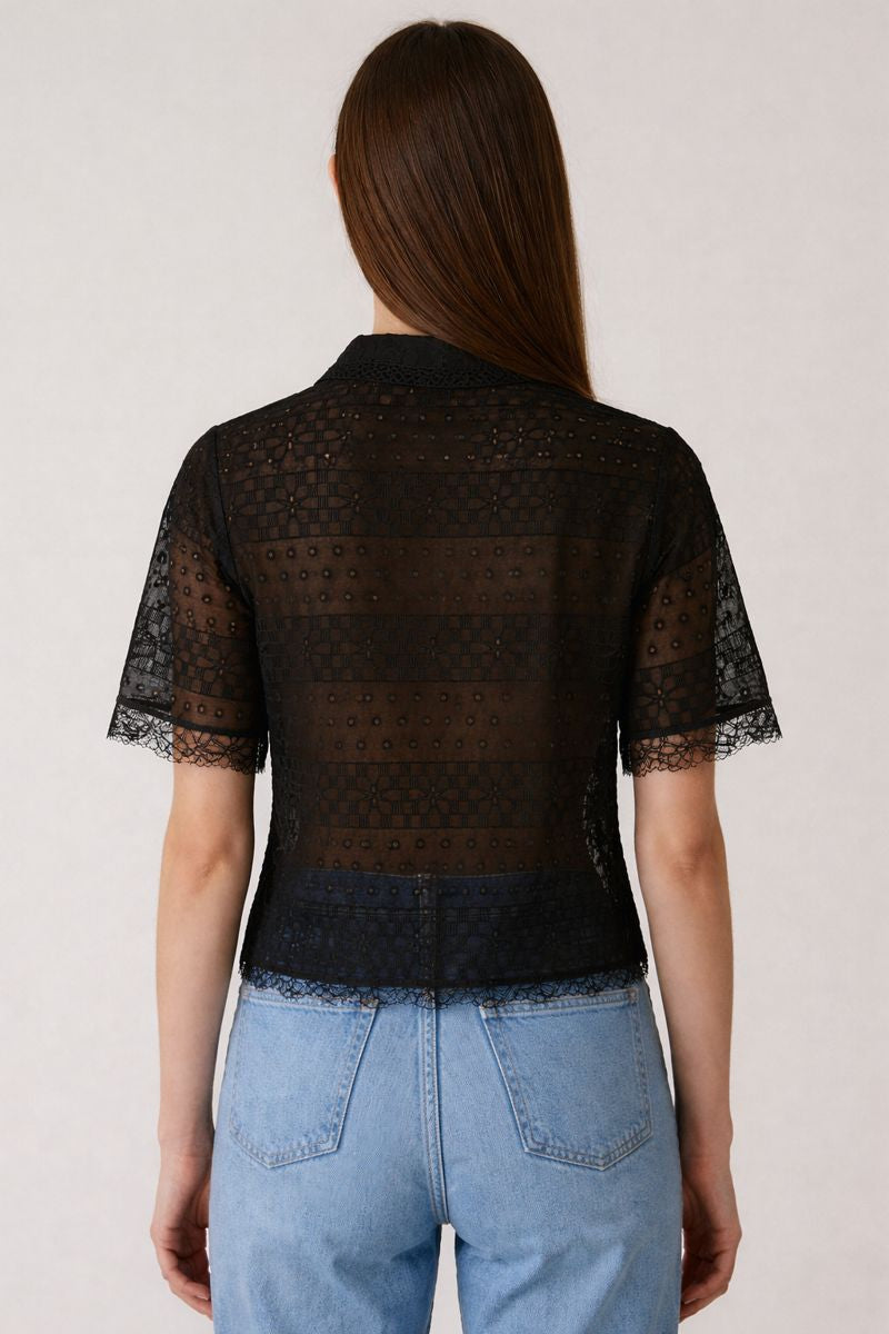 A black short-sleeve crochet cardigan with button closures and a classic collar.