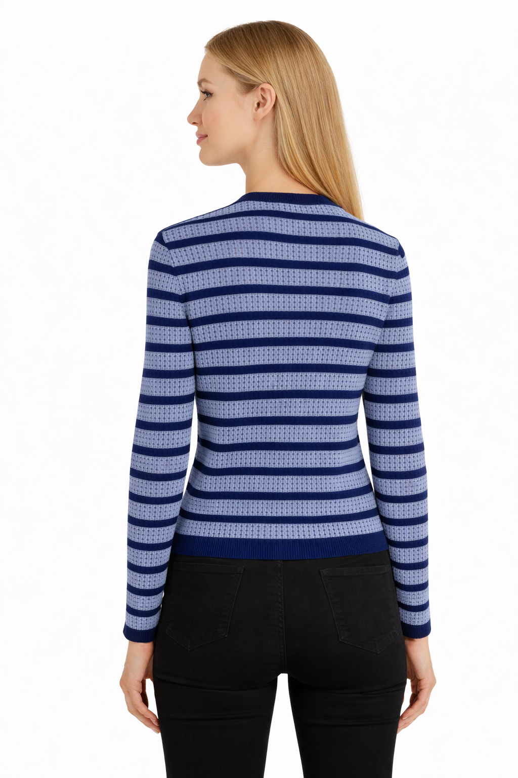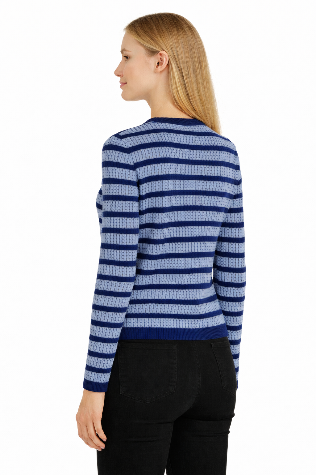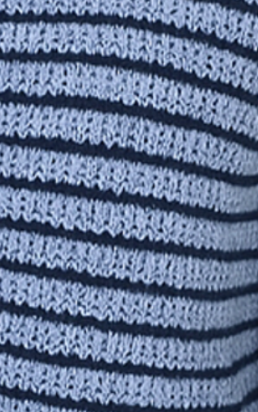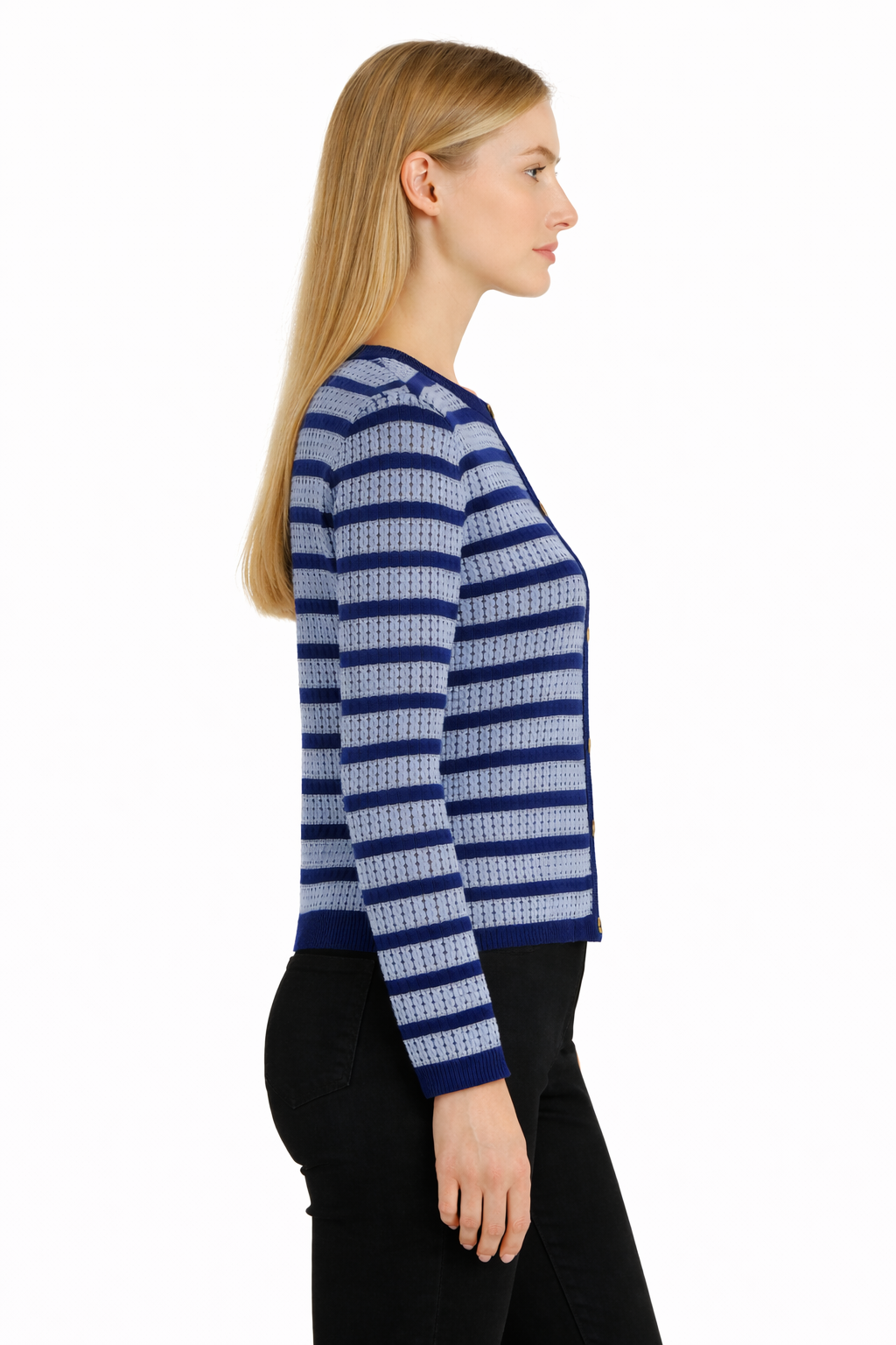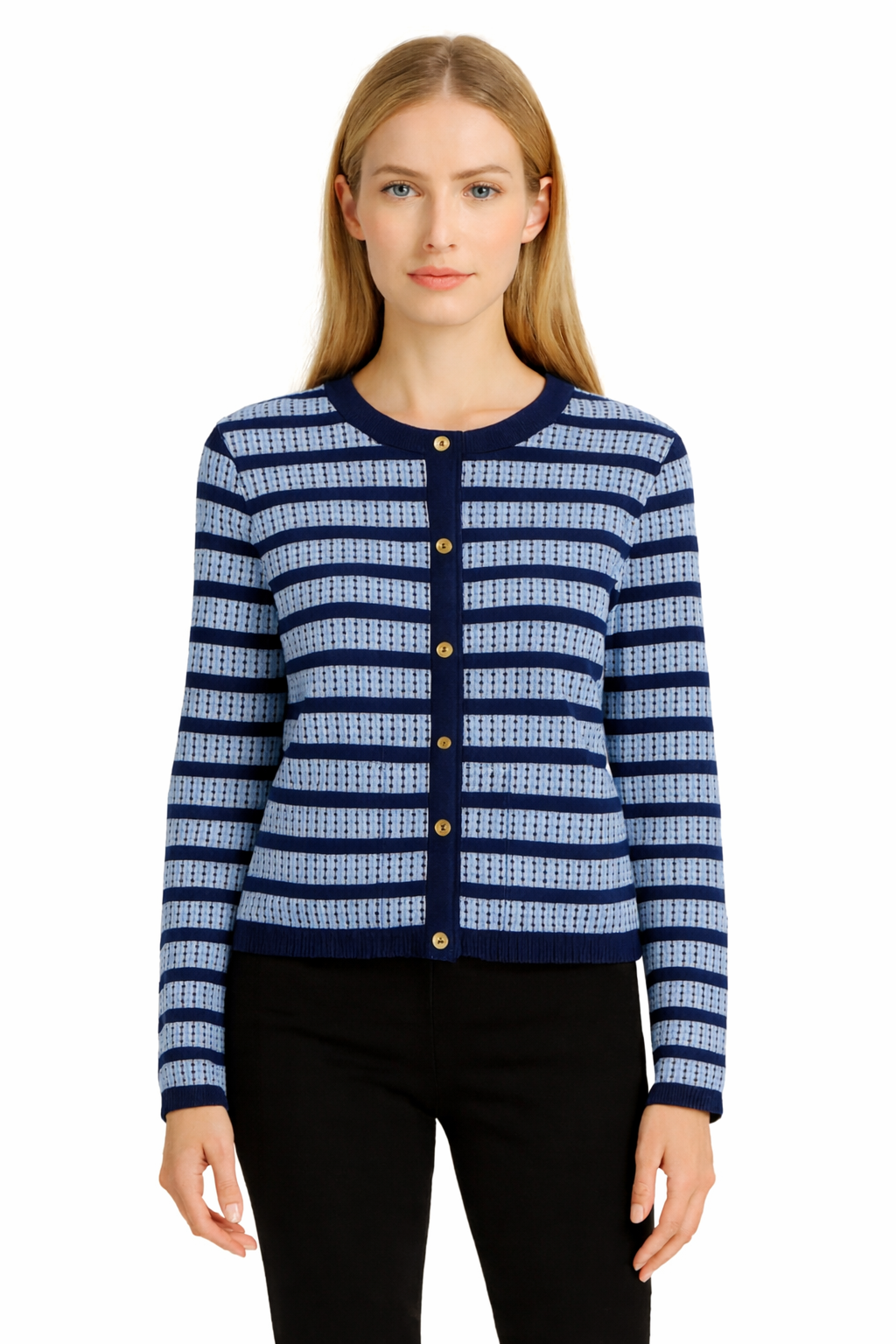 A navy and sky-blue striped cardigan featuring a soft knit texture, contrast navy trim, and polished gold-tone buttons for a refined, versatile look.