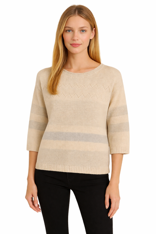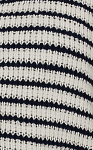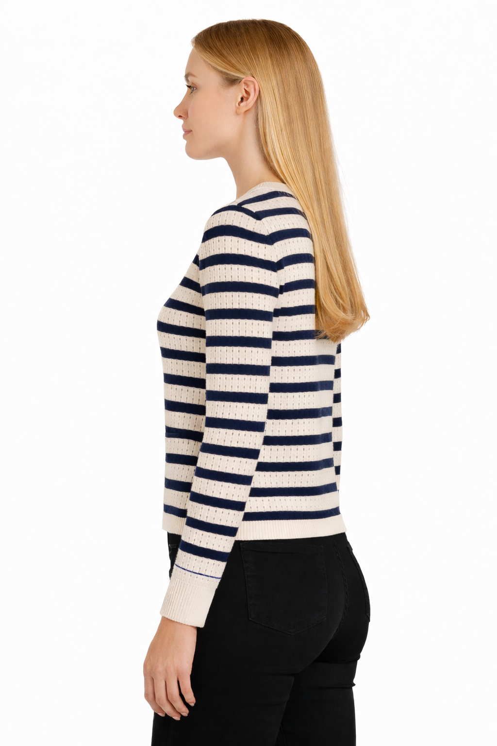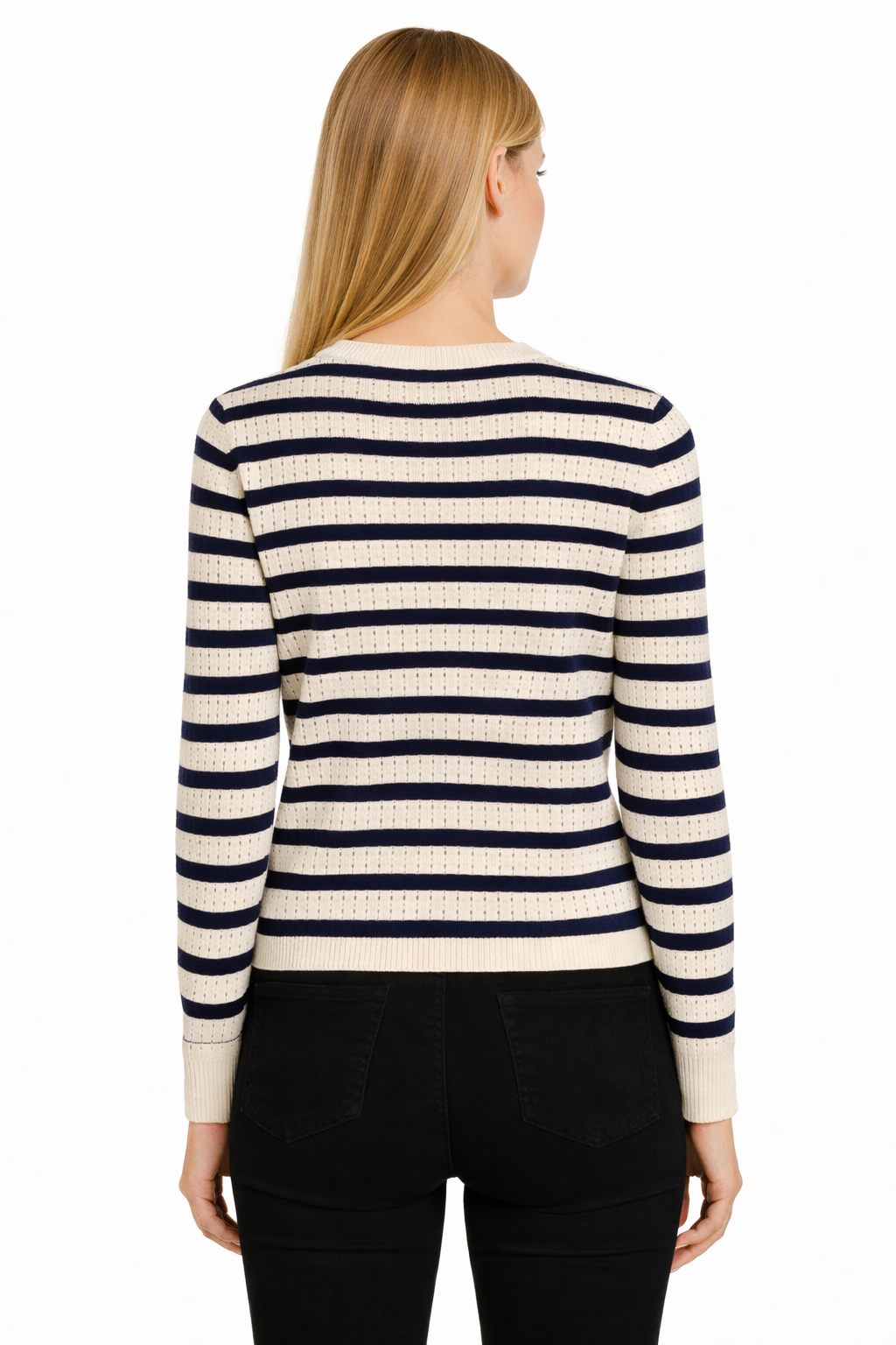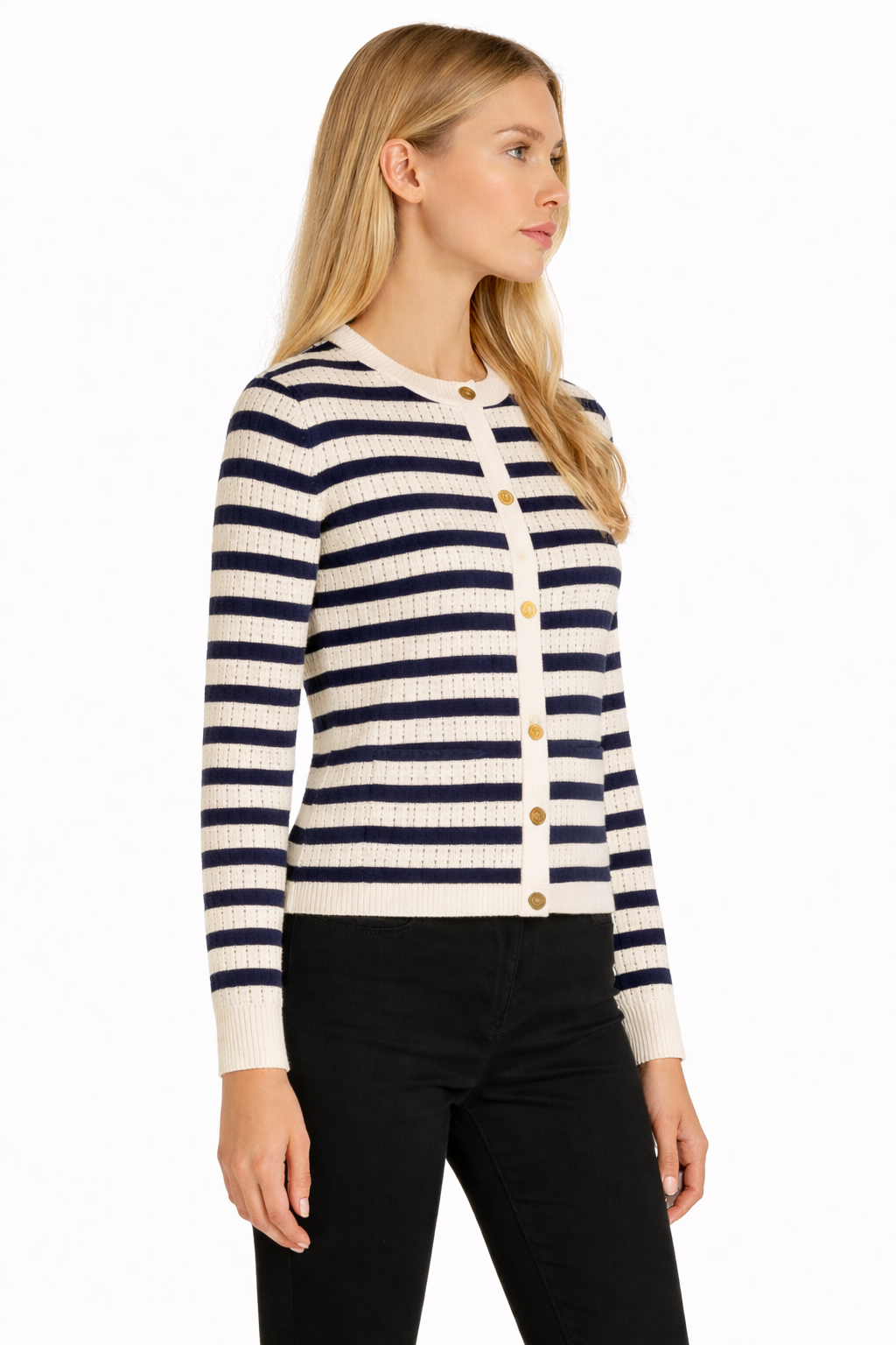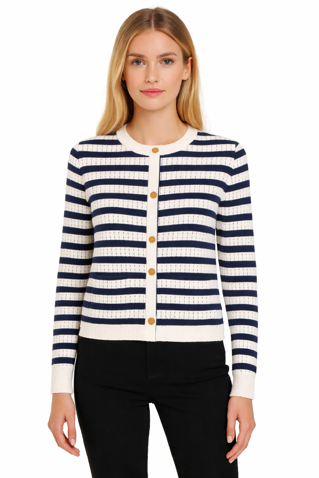 A classic navy-and-white striped cardigan with a soft knit texture, contrast trim, and button-down front for an easy, timeless look.