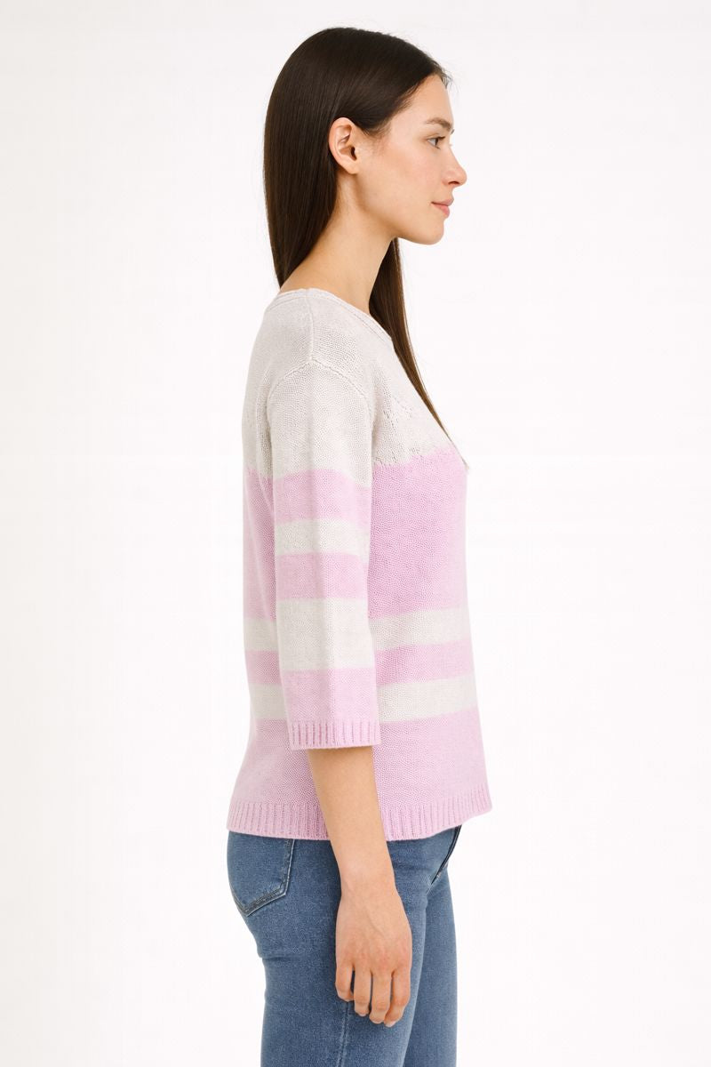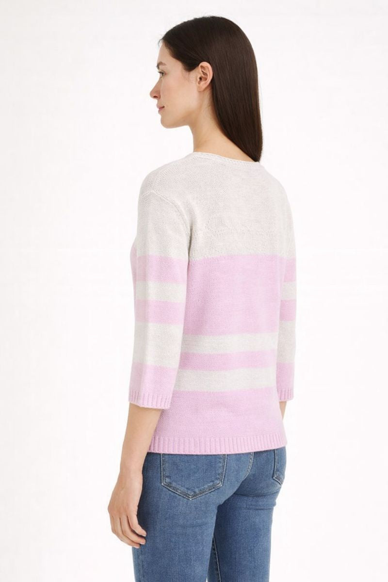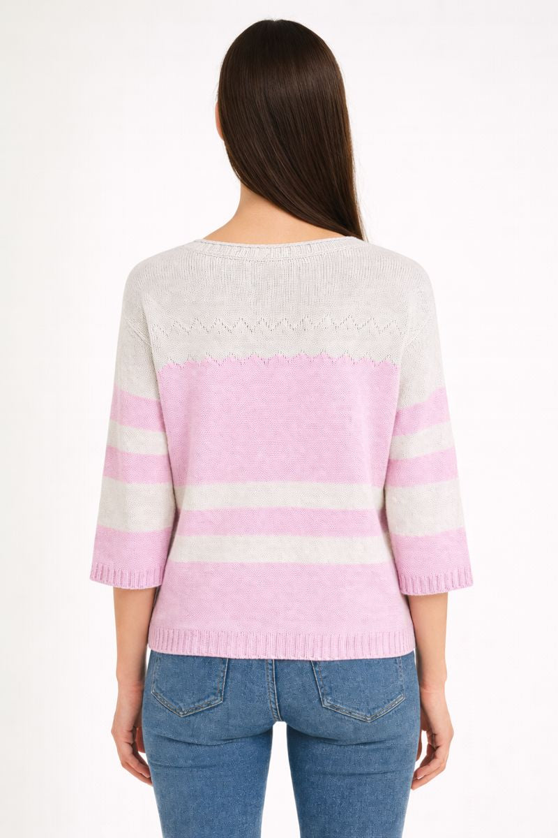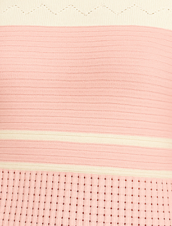 A soft, feminine knit sweater featuring pink-smoke and cream tones, delicate textured stripes, and airy perforated detailing for a lightweight, polished look.