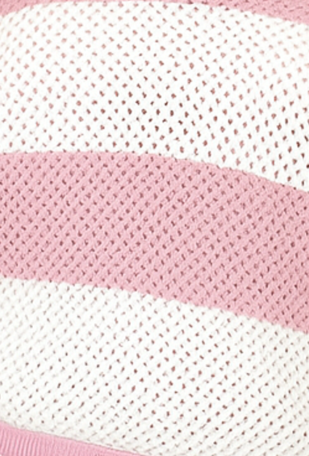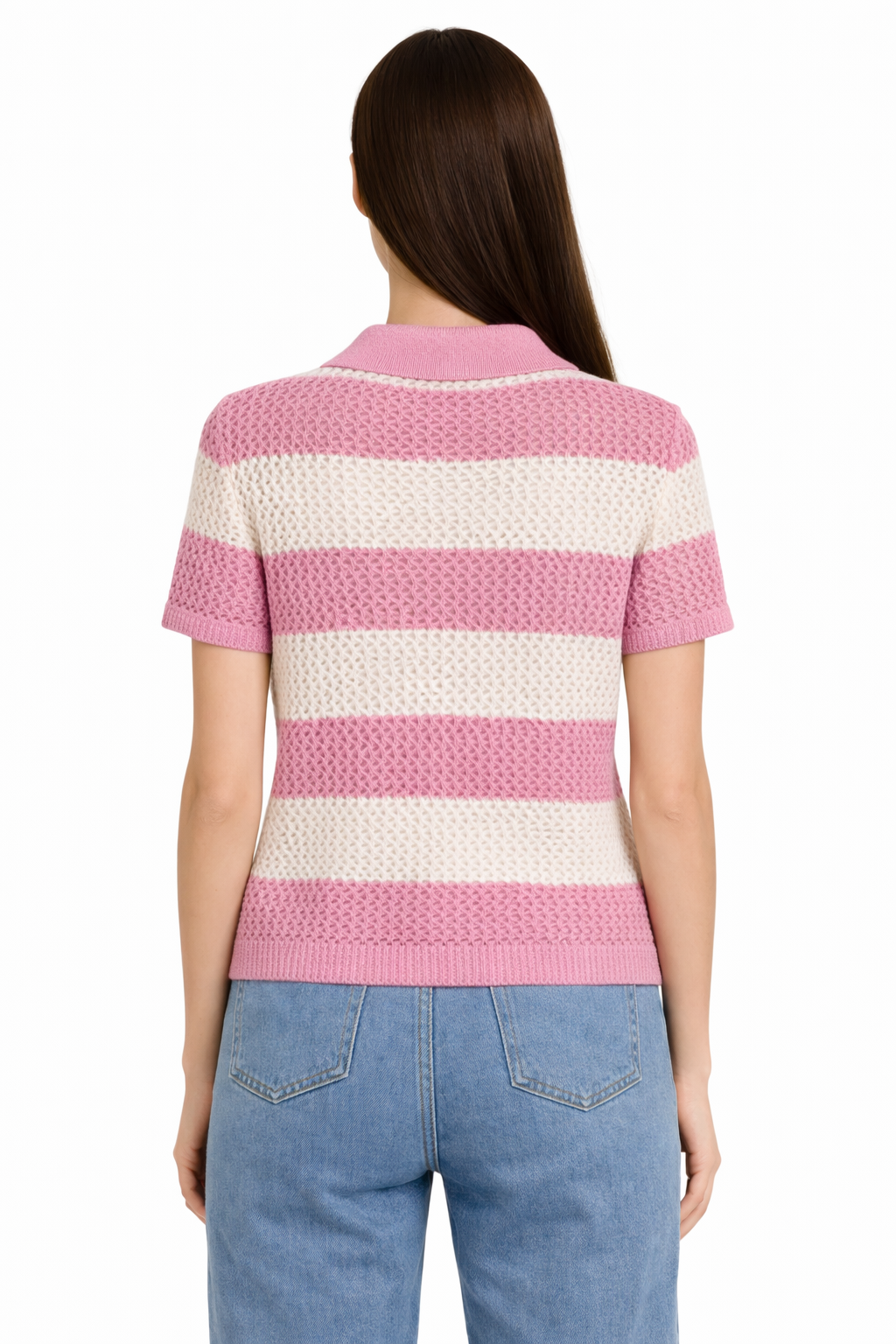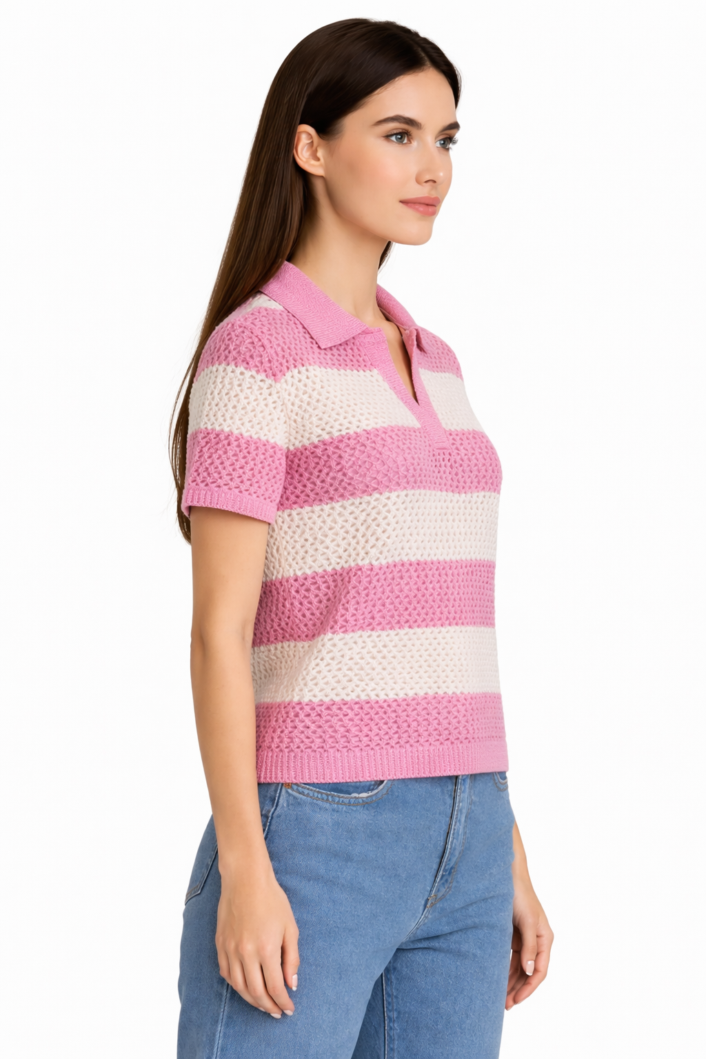 A light, airy knit top with wide pink and white stripes, a soft open-knit texture, and a relaxed collared V-neck fit.
