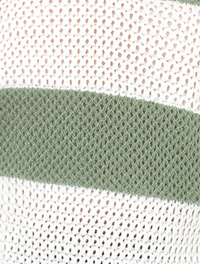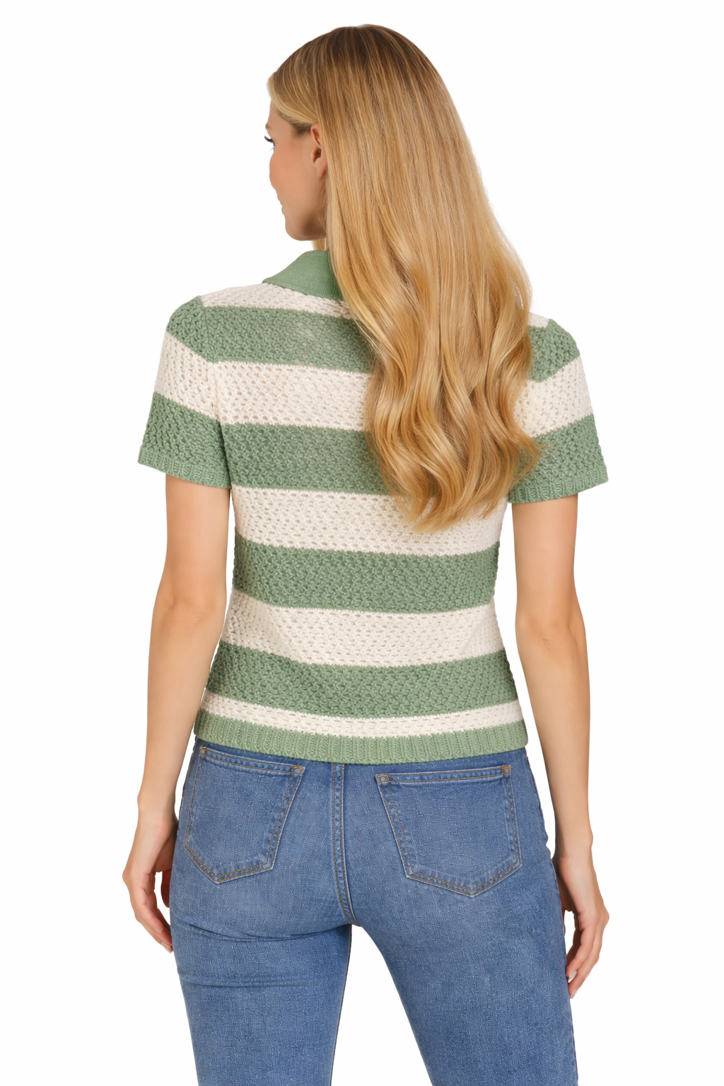 A breathable open-knit top with wide spring-sage and white stripes, finished with a relaxed collared V-neck for an easy, casual look.