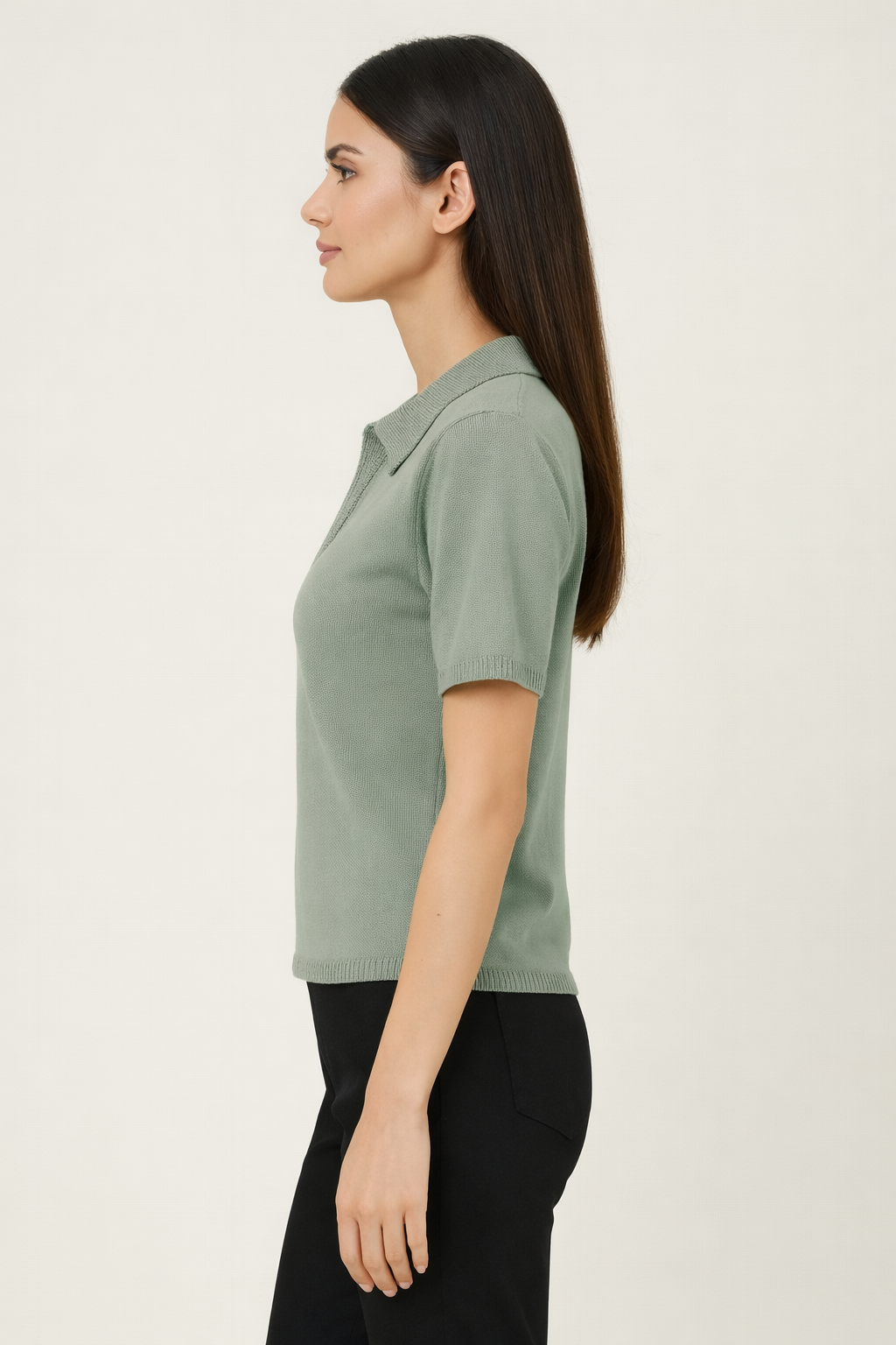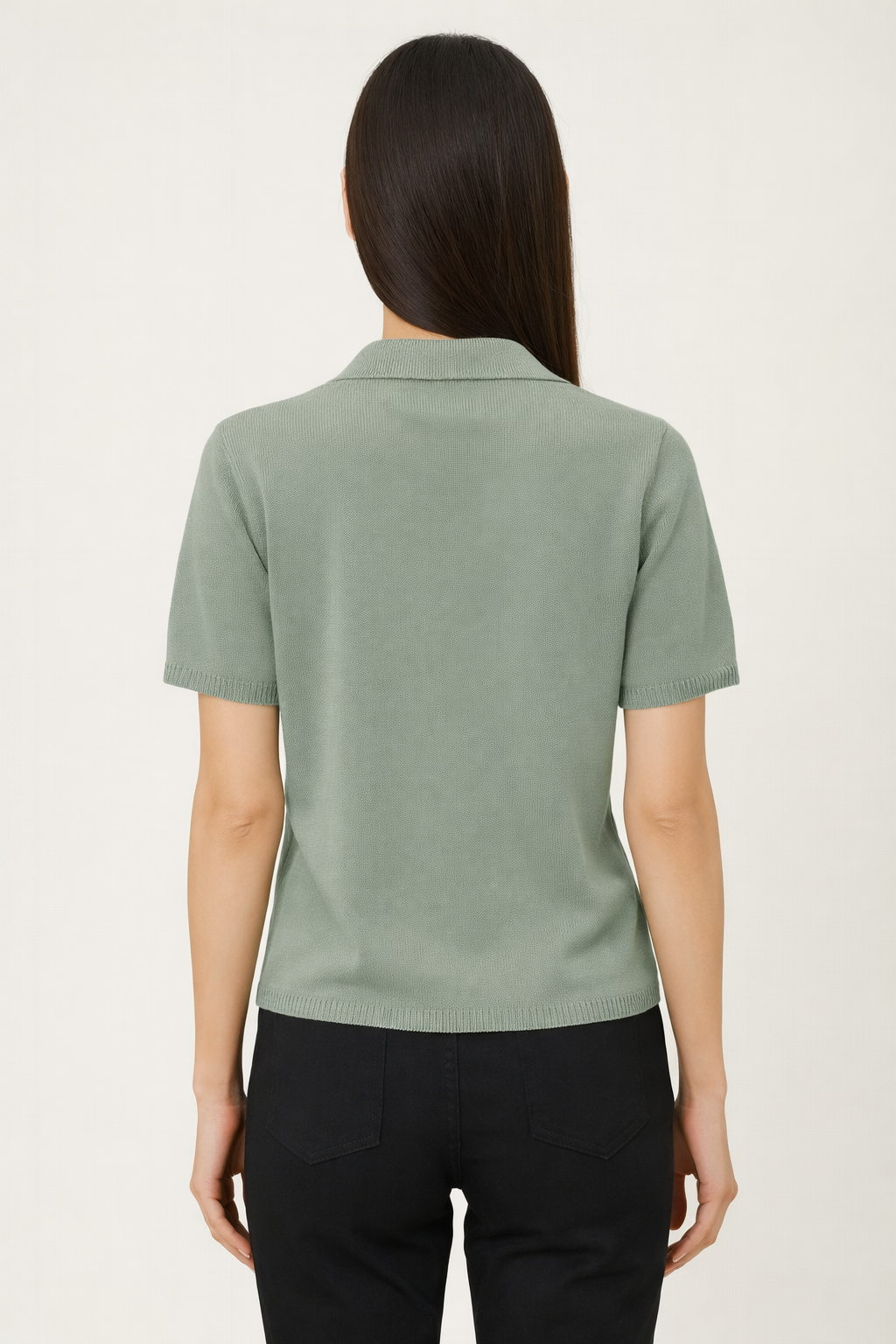 A sage green short-sleeve knit top with an openwork pattern and a soft collar.