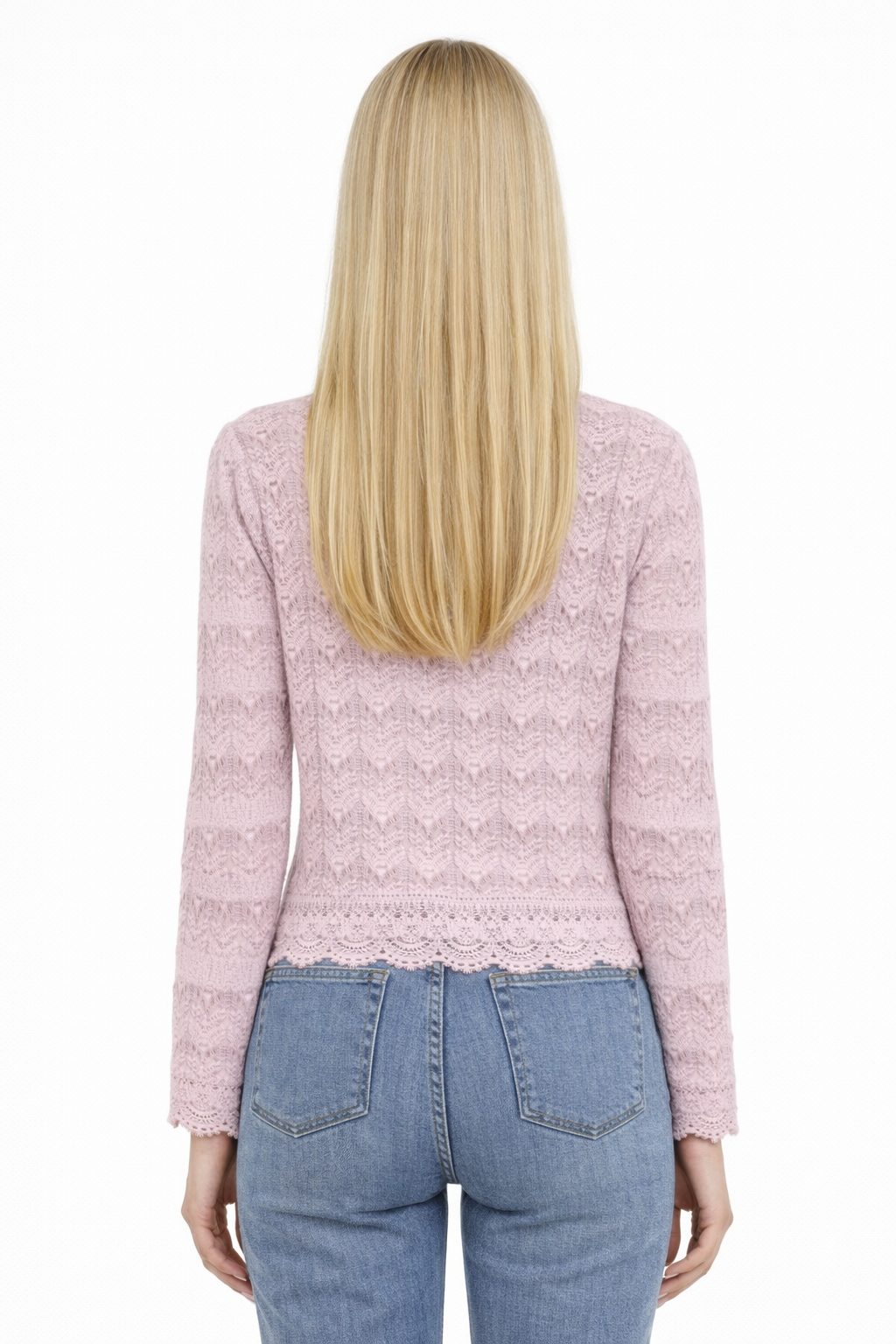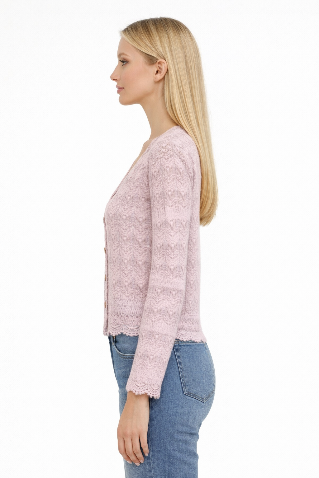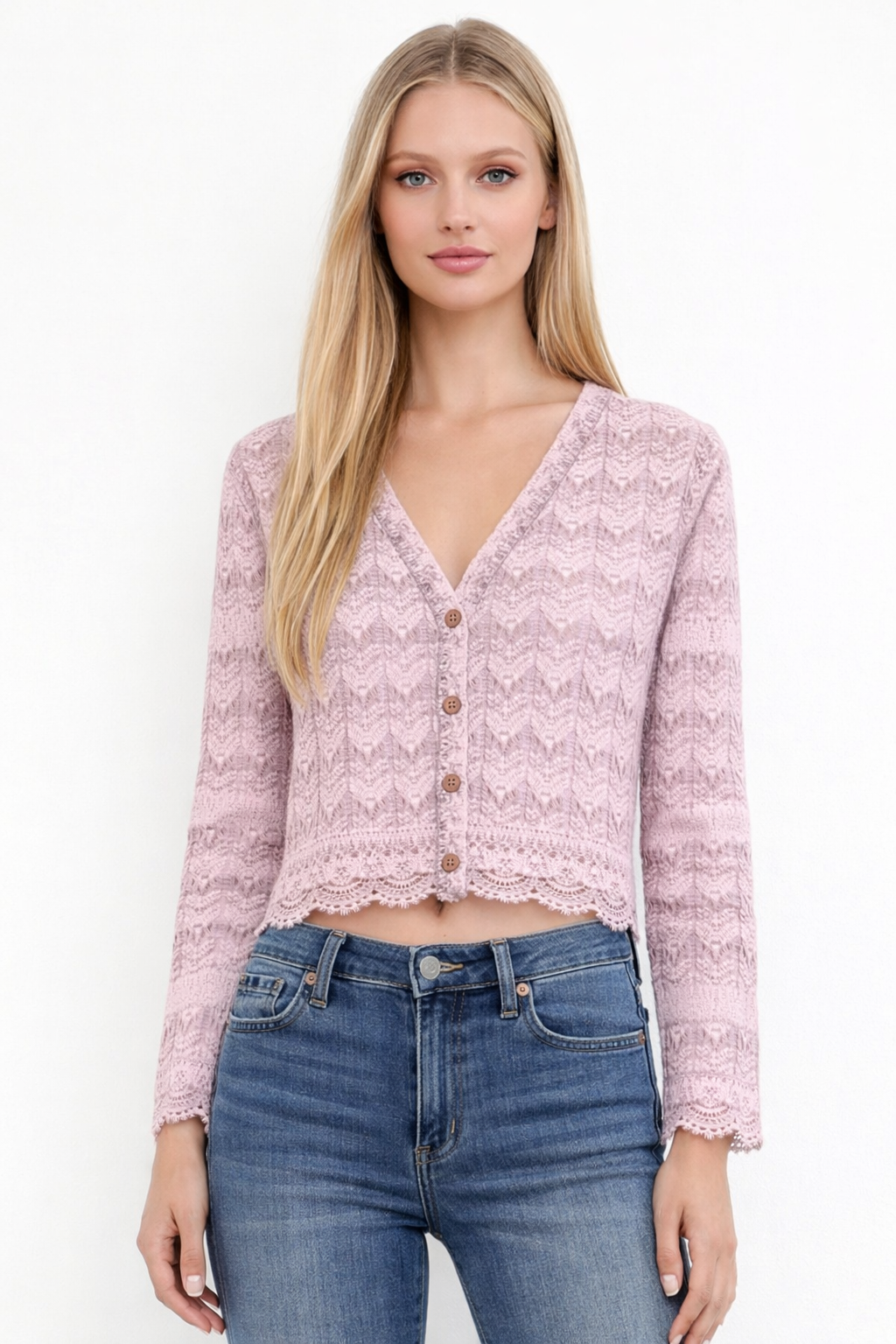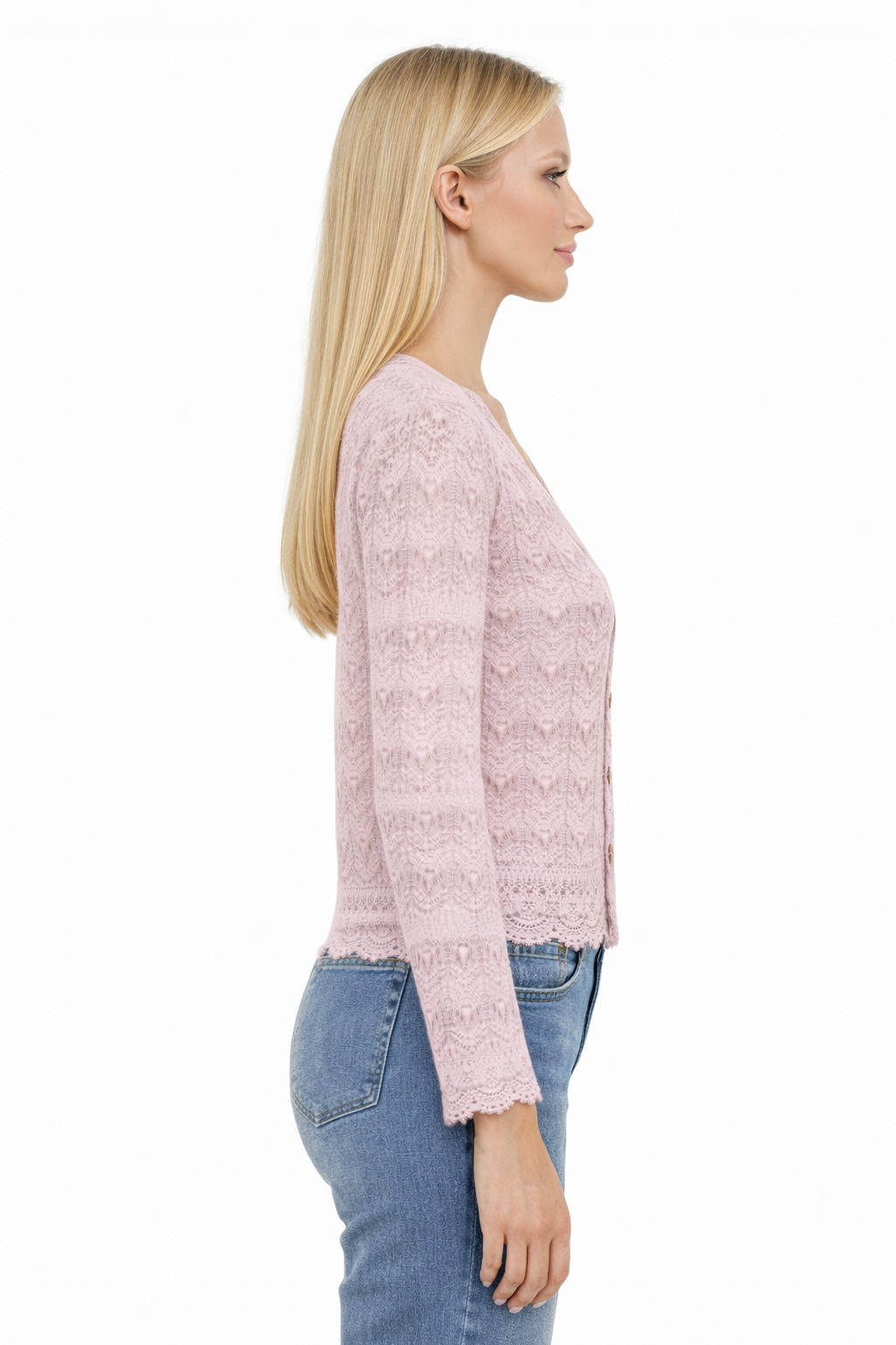 A soft pink long-sleeve crochet cardigan with a scalloped neckline, button front, and delicate open-knit pattern.