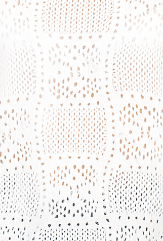 A white long-sleeve crochet sweater with a soft, open-knit patchwork design.
