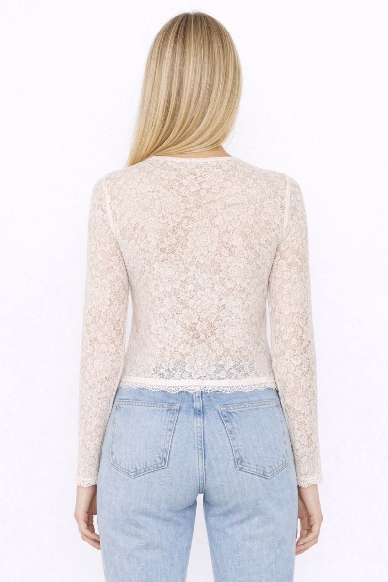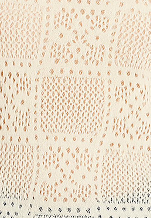 A cream long-sleeve crochet sweater with a lightweight, open-knit pattern.