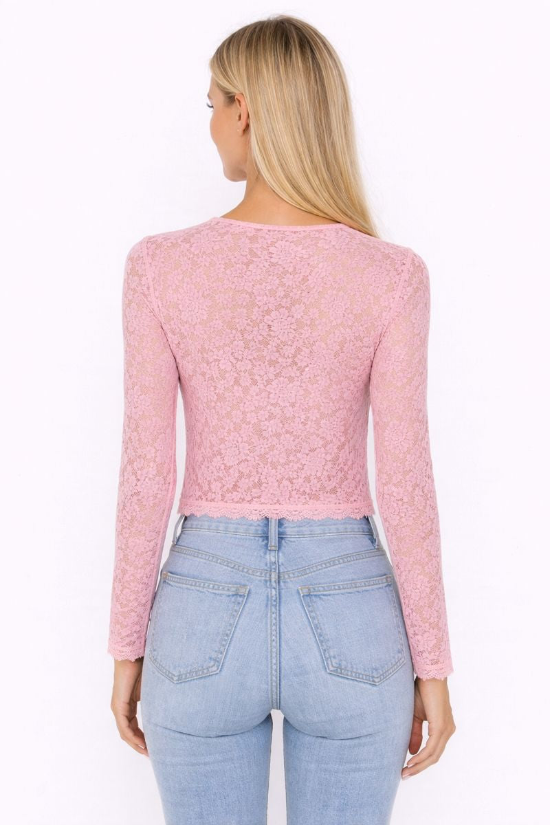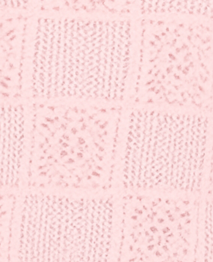 A light pink long-sleeve crochet sweater with a soft, open-knit patchwork design.